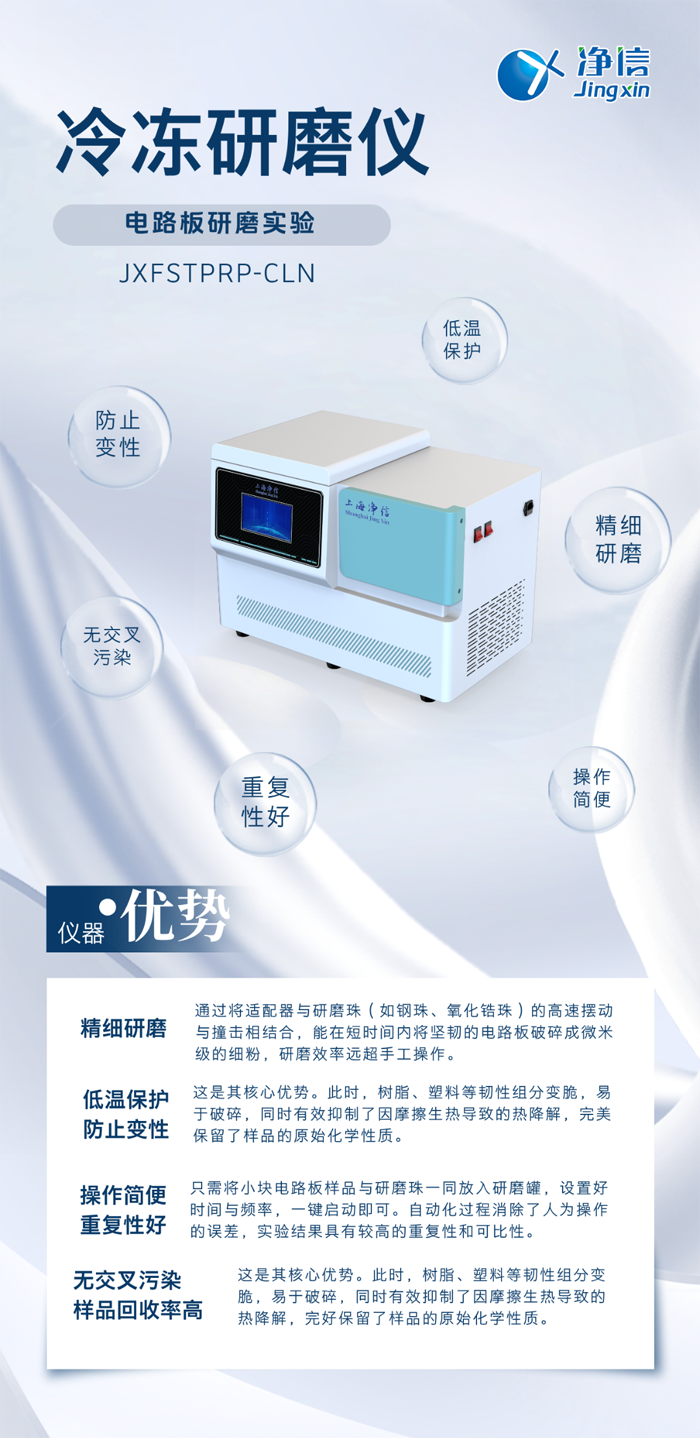 凈信冷凍研磨儀的出現,為電路板材料的樣品前處理提供了一套解決方案。它利用“低溫冷凍”與“高速撞擊”相結合的獨特原理,克服了傳統方法的弊端,展現出以下優勢。
