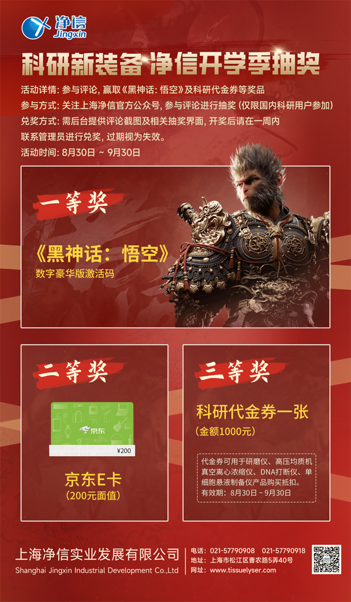 關(guān)注上海凈信公眾號,參與評論,后臺發(fā)送公眾號信息“凈信科研新裝備抽獎”即可贏取《黑神話:悟空》、京東E卡、科研代金券等獎品。