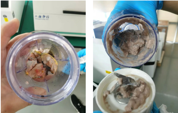 本次實(shí)驗(yàn)使用上海凈信的平行研磨儀對(duì)魚(yú)肉研磨后的肉泥非常均勻,無(wú)大塊顆粒,魚(yú)皮也被研磨充分,實(shí)驗(yàn)效果非常好,用戶(hù)很滿(mǎn)意。