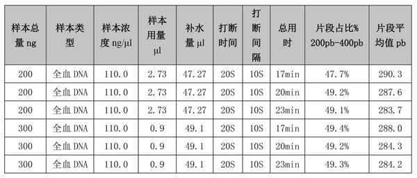 在投入量分別是300ng時,通過Qsep100片段分析儀檢測,打斷的DNA片段在200-400bp區(qū)間占比分別是