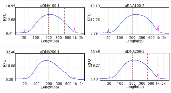 在投入量分別是200ng時,通過Qsep100片段分析儀檢測,打斷的DNA片段在200-400bp區(qū)間占比分別是