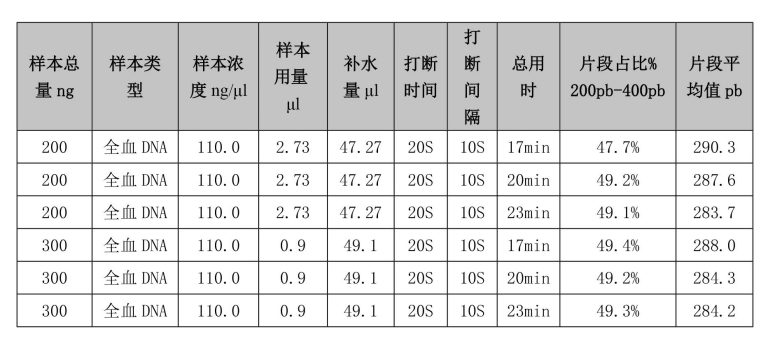 在投入量分別是300ng時,通過Qsep100片段分析儀檢測,打斷的DNA片段在200-400bp區間占比分別是49.4%、49.2%、49.3%;片段平均值分別是288.0bp、284.3bp、284.2bp,